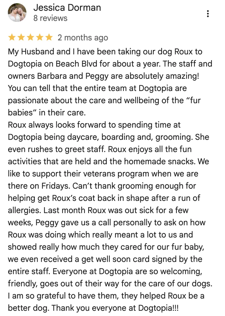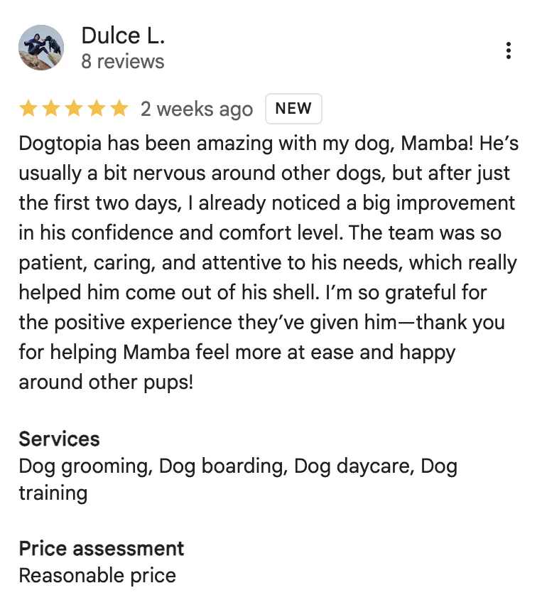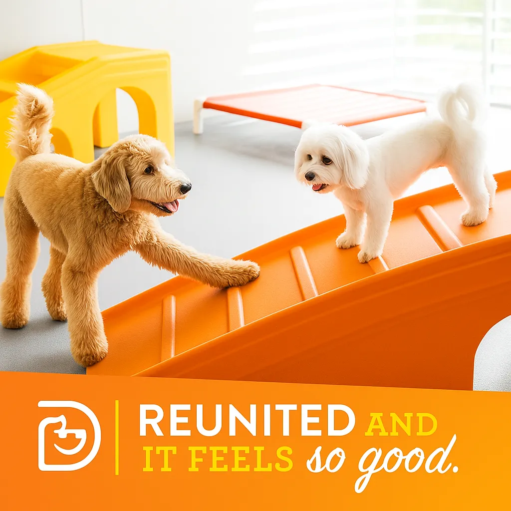 At Dogtopia, we go beyond playtime — our dogs enjoy a full day of exercise, socialization, and learning in clean, climate-controlled playrooms supervised by certified Canine Coaches. Each pup is grouped by size and temperament, ensuring safety, fun, and confidence-building in every visit.